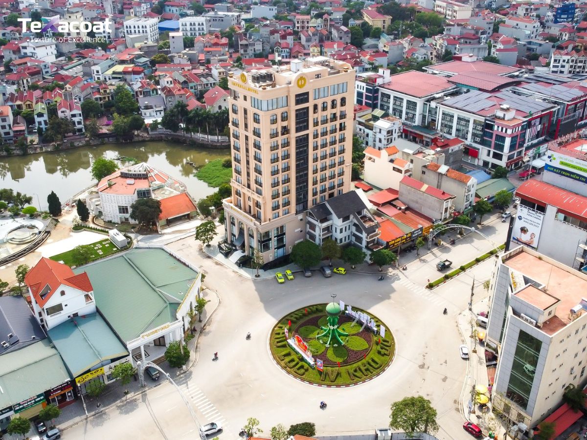 Tông vàng sáng đặc trưng được lựa chọn không chỉ thể hiện nét sang trọng, tinh tế của kiến trúc khách sạn mà còn giúp công trình nổi bật thành phố Lạng Sơn. Bề mặt sơn đá 3DX có độ nhũ nhẹ, ánh sắc thay đổi tinh tế theo từng góc nhìn và điều kiện ánh sáng, mang lại hiệu ứng thị giác cao cấp – điều mà các dòng sơn thông thường khó có thể đạt được.