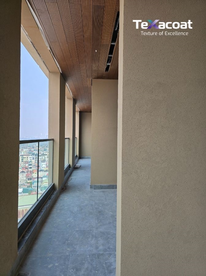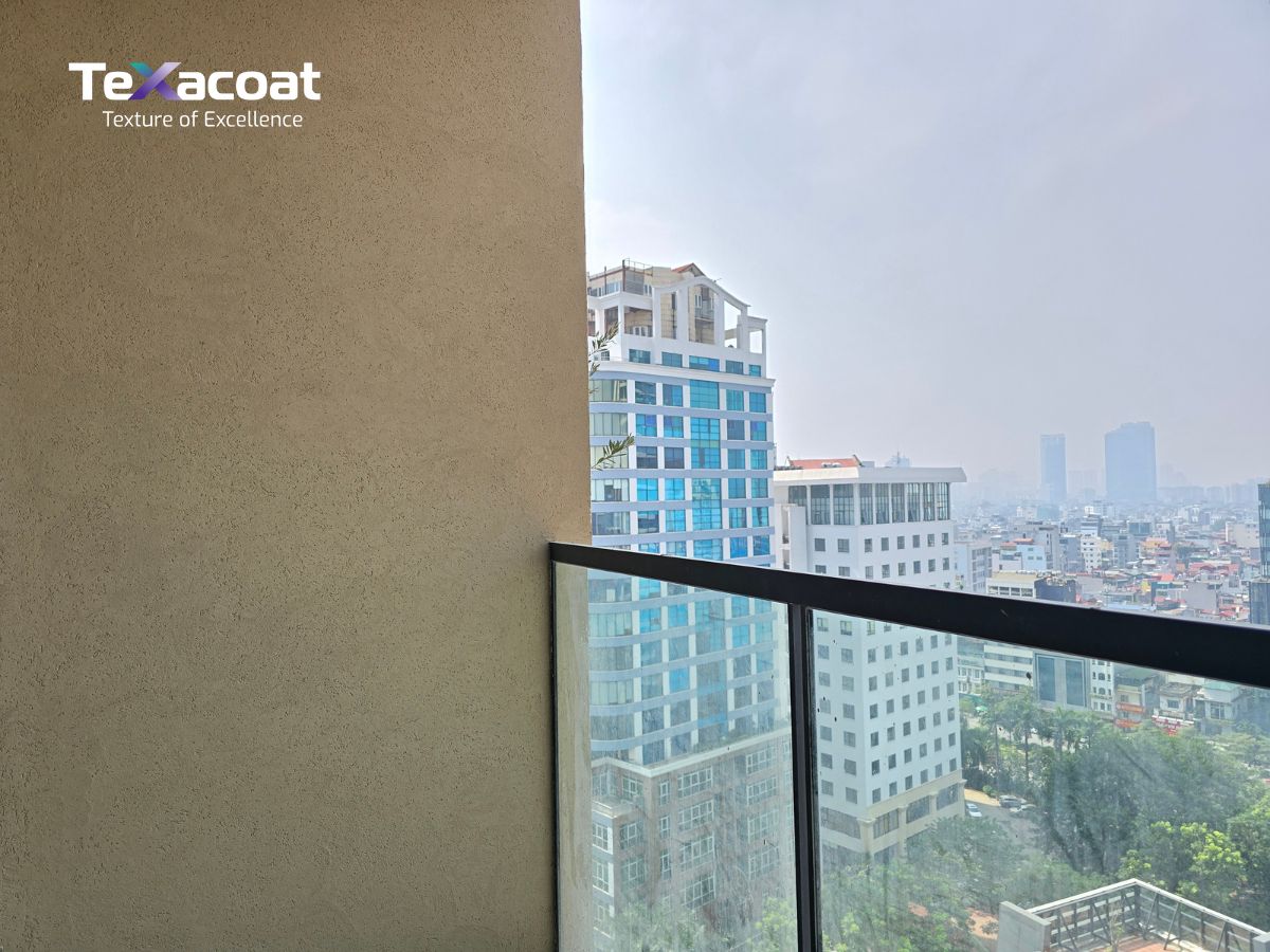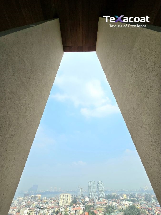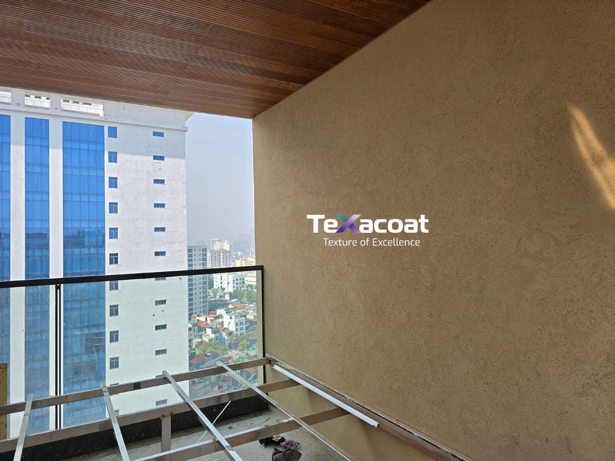 Để hiện thực hóa mong muốn ấy, đội ngũ thi công đã lựa chọn vữa hiệu ứng Stucco TexaCoat mẫu đá vôi – XS-021 làm vật liệu hoàn thiện chủ đạo. Mẫu hiệu ứng này có độ mịn vừa phải, cho phép bề mặt thể hiện được chiều sâu tự nhiên mà vẫn giữ được cảm giác mềm mại, tinh tế. Khi ứng dụng trên diện tích lớn như tường và trần của Penthouse, hiệu ứng đá vôi giúp không gian trở nên thoáng đãng, đồng nhất và sang trọng mà không cần quá nhiều chi tiết trang trí.